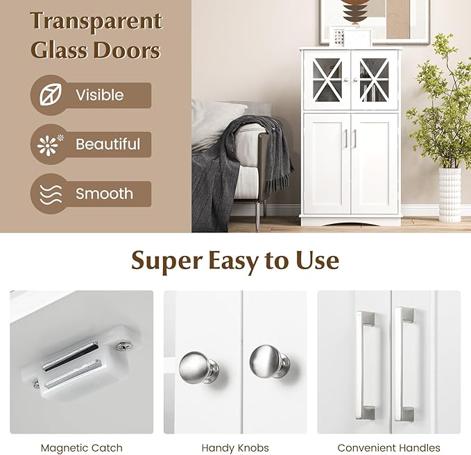- [2 Transparent Glass Doors]: The upper glass doors not only prevent outside water, but also bring more texture and charm. 2 visible glass doors also allow you to see the inside items. Besides, 2 handy knobs enable you to conveniently open the glass doors to reach for what you need.