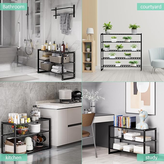 - 𝟓 𝐓𝐢𝐞𝐫 𝐒𝐭𝐚𝐜𝐤𝐚𝐛𝐥𝐞 𝐒𝐡𝐨𝐞 𝐑𝐚𝐜𝐤 : 3-5 pairs of adult shoes can be placed on each layer, and extra bottom storage for flats, slippers and flip-flops is enough. The entryway shoe racks have a perfect tenon design without stacking tools. The product is stackable, and you can also use it as a 2 tier shoe rack, 3 tier shoe rack or 5 tier shoe rack according to your needs.