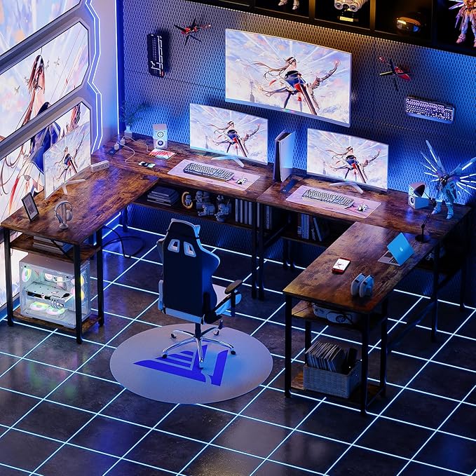 Unikito L Shaped Computer Desk with Magic Power Outlets and USB Charging Ports, Sturdy Reversible Corner Desk with Storage Shelves, Modern Work Desk for Home Office, Easy to Assemble, Rustic Brown