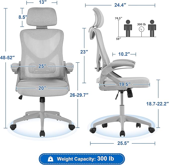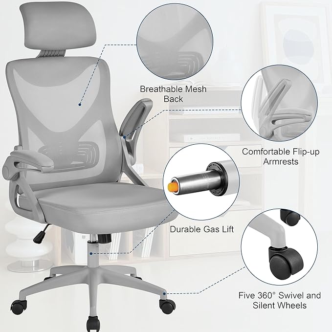 Yaheetech Ergonomic Mesh Office Chair, High Back Desk Chair with with flip-up Armrests, Adjustable Padded Headrest Computer Chair with Lumbar Support for Home Oiffce Game Room, Full Gray