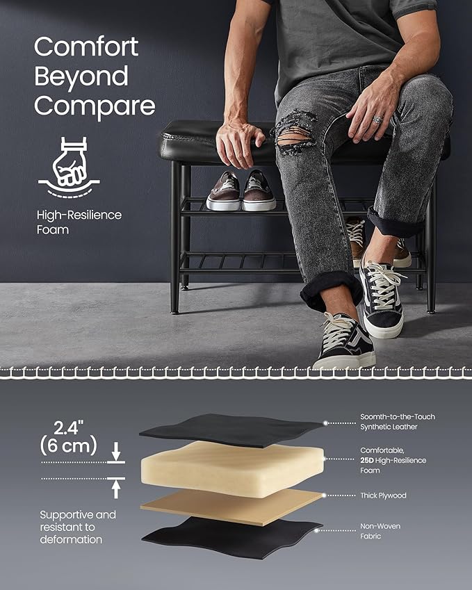- [Comfort at Every Sit] Glide your hand over the smooth cover, then sink into the supportive 2.4" thick, 25D high-resilience foam, designed to resist deformation. This shoe bench provides a comfortable seat that endures, standing the test of time