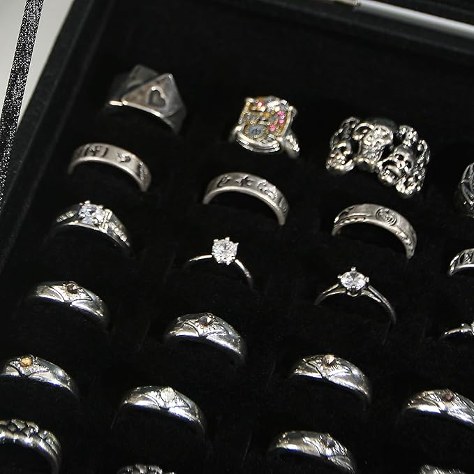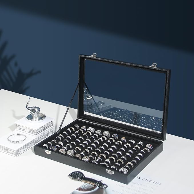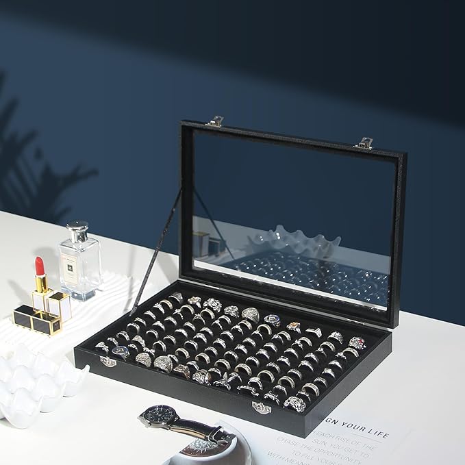 Coward Ring Organizer Jewelry Box, Black Velvet 100 Slots Ring Display Tray Case with Transparent Glass Lid for Home Use or Store Selling Show