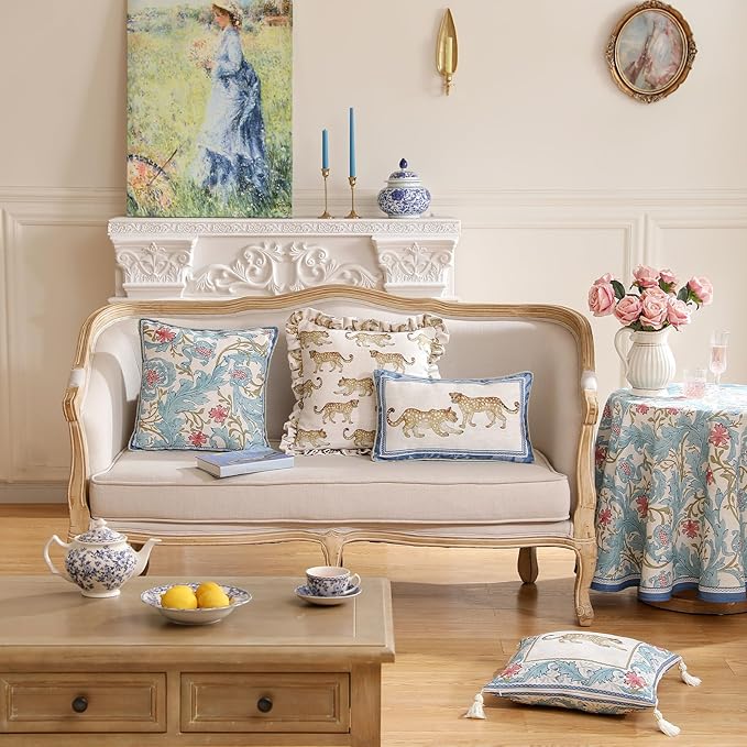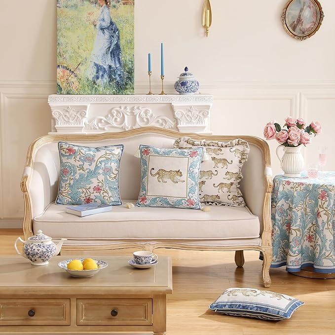 patdrea Designer Throw Pillow Covers for Couch 18"x18",Vintage French Linen Pillows Cover with Blue Floral Pattern,Fall Luxury Farmhouse Decorative Pillowcases for Bed Living Room Outdoor Set of 2