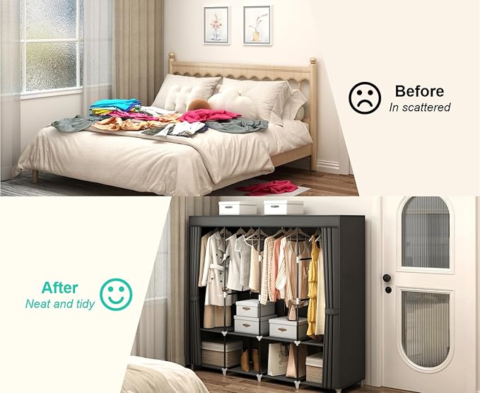 - 𝐋𝐚𝐫𝐠𝐞 𝐂𝐥𝐨𝐬𝐞𝐭 𝐒𝐭𝐨𝐫𝐚𝐠𝐞: This portable closet wardrobe consists of 4 movable hanging rods for clothes, jackets, dresses, coats; 8 storage shelves for folded clothes, bags, hats, accessories, underwear and socks. It will increase space usage of your bedroom.