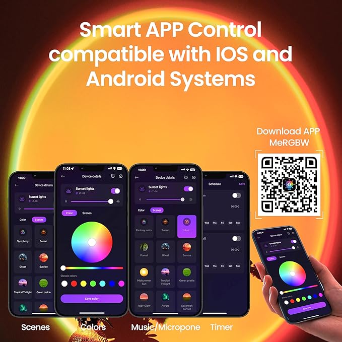 - Endless RGB Colors: Our upgraded sunset projection lamp boasts high-refraction lenses, a wider light-emitting surface, and a larger projection range. With over 21 colors and 4 dynamic modes to choose from, you can easily set the perfect lighting ambiance for various scenes and moods using either the remote or the app.
