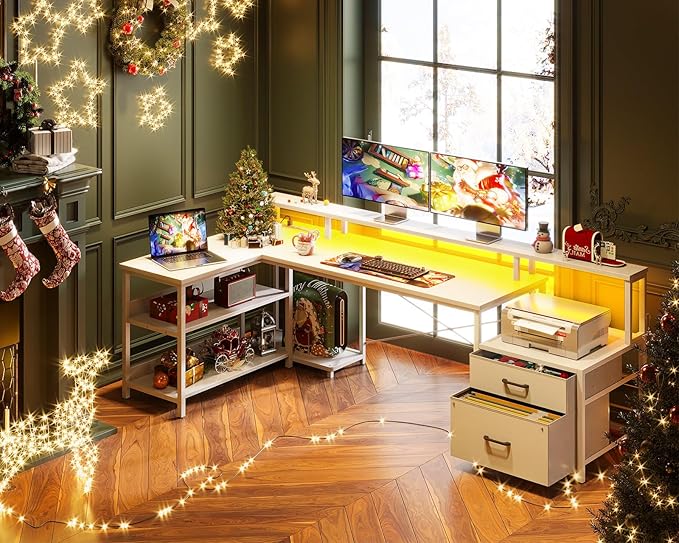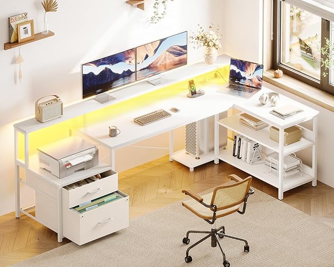 ODK L Shaped Desk with File Drawer, 75" Reversible L Shaped Computer Desk with Power Outlet & LED Strip, Home Office Desk with Storage Shelves, Gaming Desk with Monitor Shelf, Corner Desk, White