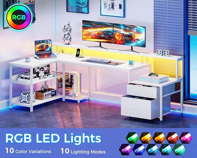 - 【Cool LED Lighting 】: The l shaped gaming desk offers a wide range of options for LED lights, including 7 colors, 13 modes, 8 adjustable brightness levels, and 9 flicker frequencies. With its memory function, it will remember the last mode used when turned on. Choose your preferred color and mode to start the game.