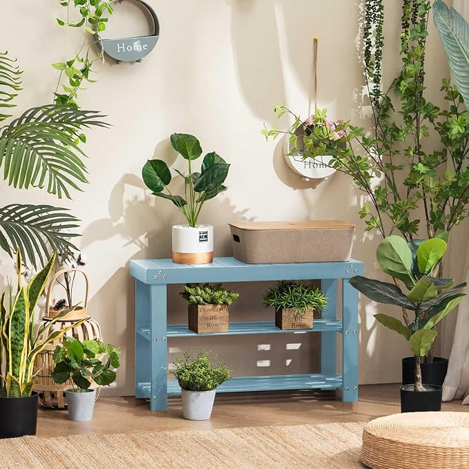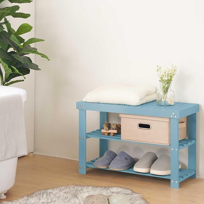 Apicizon Bamboo Shoe Rack for Entryway, 3-Tier Shoe Rack Bench for Front Indoor Entrance, Small Shoe Organizer with Storage, Blue