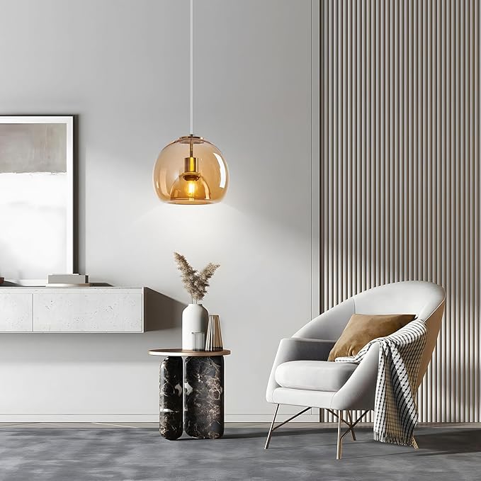- [Unique Design] The simple and stylish design of the amber glass shade of this gold pendant light gives it a fresh and comfortable feel, taking full advantage of the bulb's optimal performance to maximize the light and create the room of your dreams. The gold finish on the metal parts completes the look and accentuates your personal décor