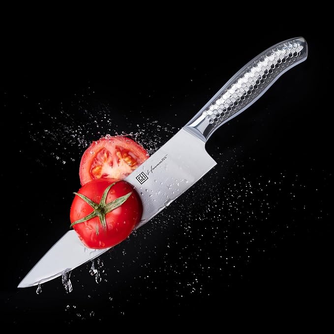 - Comfortable grip kitchen knife: Stainless steel handle with non-slip hexagonal honeycomb pattern and built-in weight for perfect balance and control. Ideal present for a wedding, birthday, house-warming party
