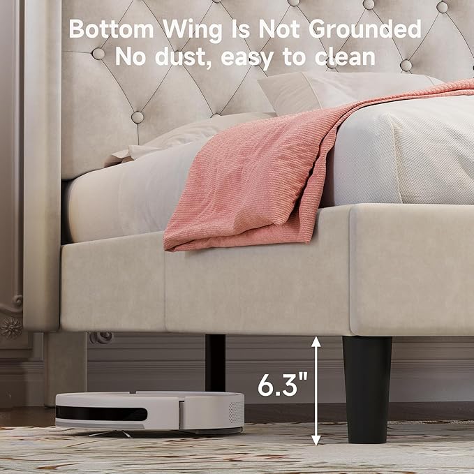 - 【Multi-functional storage space】Leave enough space at the top of the headboard to easily place small items such as mobile phones, alarm clocks, books, and decorations. The 6.3-inch height space under the bed allows for the storage of more household items, easy storage of luggage, shoeboxes and storage boxes, and the sweeping robot can easily pass through to keep the bedroom clean and tidy. This is a popular style for families with limited space.