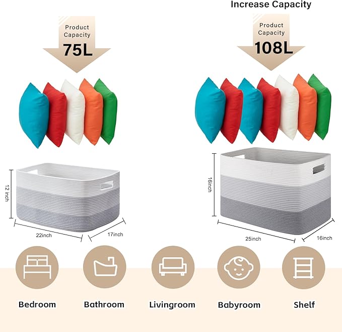 OIAHOMY 108L Large Cotton Rope Basket, Rectangle Woven Baskets for Storage, Nursery Blanket Storage Living Room, Toy Basket With Handle-25”x16”x16”-Gradient Grey