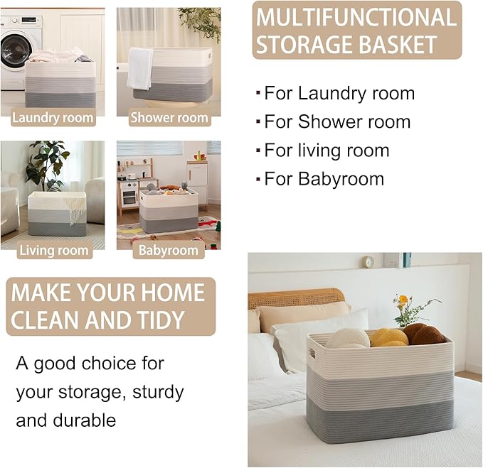 - Washable Large Basket: This large basket can be washed by hand or machine with gentle detergent. If machine washed, please put them into a laundry bag. NOTE: These cotton rope baskets are folded when shipping, but it will turn back to its elegant shape quickly if you fill it with some towels or clothing, and iron is great idea to remove the creases