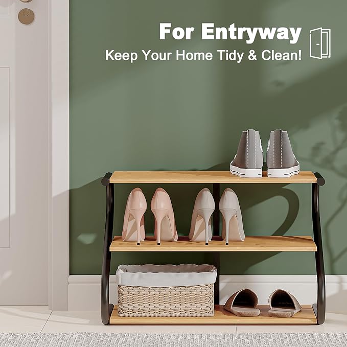 Bamboo Shoe Rack, Z-Frame Wooden 3-Tier Shelf with Durable Metal Shelves, Shoe Organizer for High Heels, Hallway, Living Room, Closet, Bedroom (Natural)