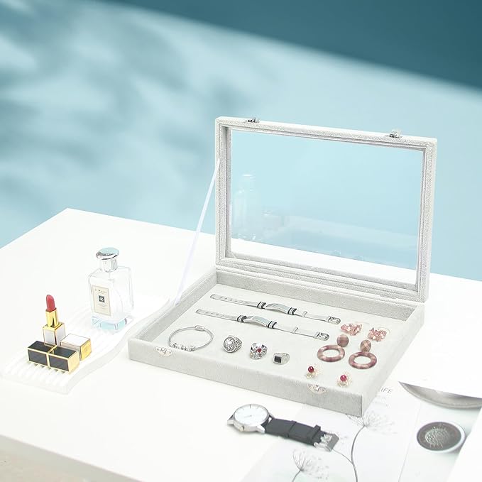 - Instead of cheap plastic lid, we us thick clear glass window at the top of the jewelry case, that allows you to see all the jewelry at a glance.