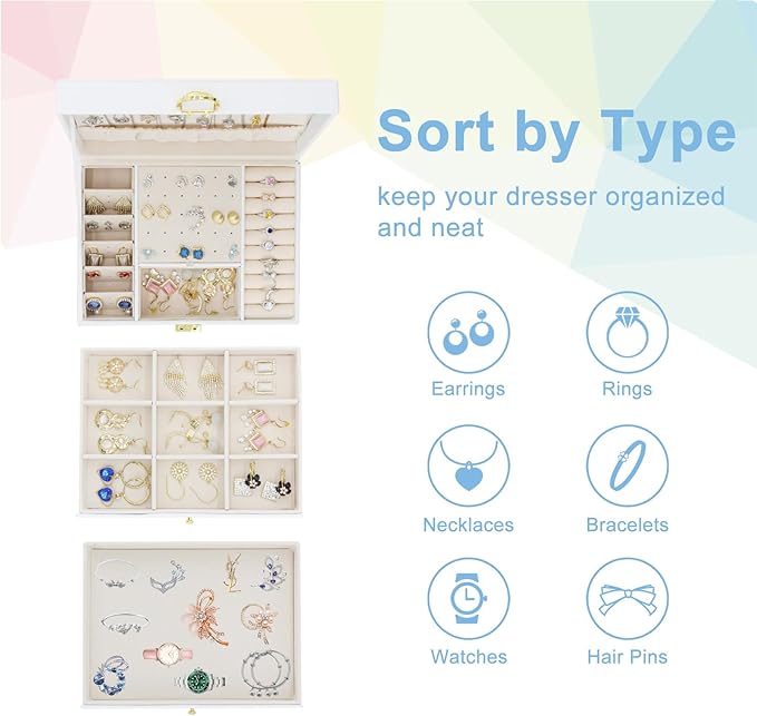 - 【Large Capacity Travel Jewelry Case】The jewelry holder uses a 3-layer design with 2 drawers. The lid has hooks and small pockets for necklaces or long earrings; The first compartment is for earrings and rings; The second compartment can store small items, hair clips or charms; The compartment space can be adjusted freely; The third compartment is a large drawer where you can put larger items, watches or lipsticks and so on.
