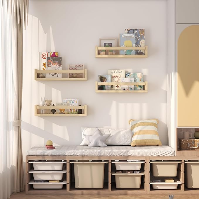 Onlysky Set of 4 Wall-Mounted Kid's Bookshelf - Wood Floating Nursery Book Shelves - Durable Wood Construction - Ideal for Nursery Decor, Kids Room, Toy Storage