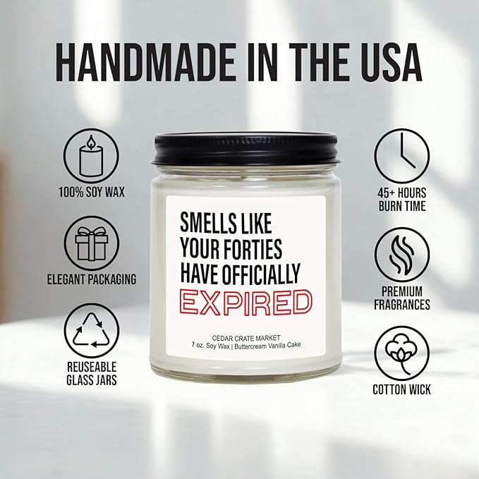 - BIRTHDAY CANDLE GIFTS: "Smells Like Your Forties Have Oficially Expired", 9-ounce reusable Glass Jar, Scented Soy Candle, carefully packaged in a cute gift box. It is an excellent present for your best friend, bff, bestie, work friend, forever friend, or true friend. Best Friend Birthday Gift, Best Friend Birthday Gift, Heartfelt gift for Best Friend Going Away Gift, long distance friendship, bday, gift, or any gifting occasion.