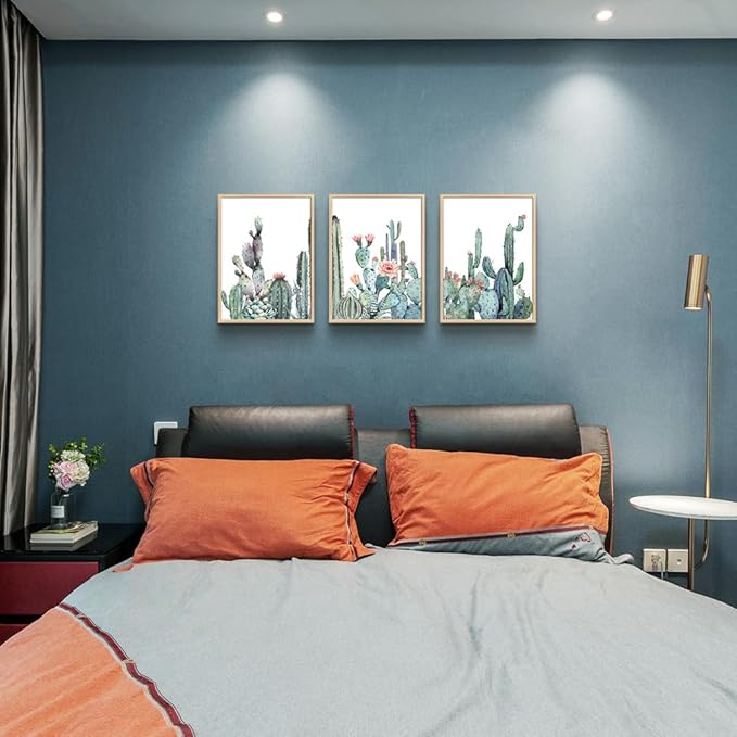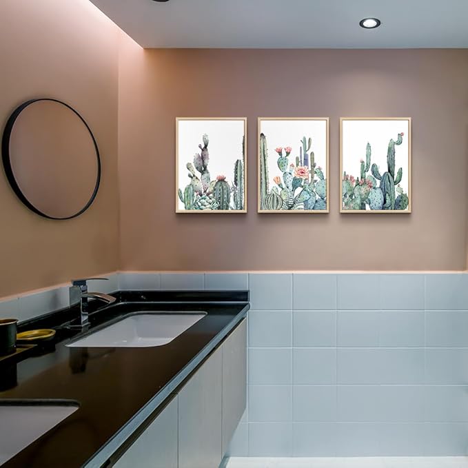 Framed Wall Art For Living Room Wall Decor Bedroom Wall Picture Artwork Of 3 Piece Green Plants Succulent Cactus Flower Painting Ready To Hang Modern Kitchen Home Decoration (Natural Wood Framed)