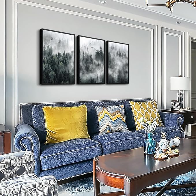 MHARTK66 Black Framed Wall Art For Living Room Modern Decorations Bedroom Foggy Forest Trees Landscape Painting Office Decor Home Ready To Hang a Pictures Of 3 Piece Prints