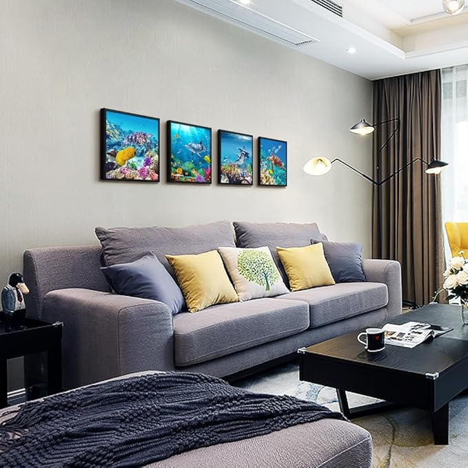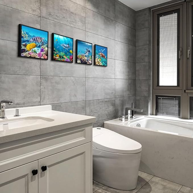 Set Of 4 Piece Black Framed Wall Art For Living Room Family Bedroom Wall Pictures Artwork Bathroom Wall Decor Coral Sea Fish And Turtles Blue Ocean Theme Painting Ready to Hang Modern Home Decor