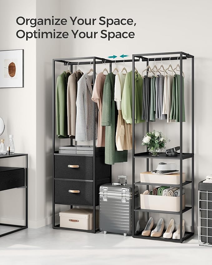- [Multi-Purpose Clothes Rack] Featuring 2 fixed hanging rods, 1 extendable hanging rod, 2 fabric drawers, and 4 panel shelves, this portable closet is designed for shirts, jackets, pants, shoes, bags, suitcases, and other accessories
