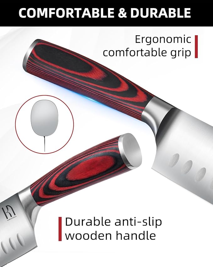- 【Effortless Cutting】This sharp kitchen knife incorporates a Granton design with precision-engineered scallops on both sides of the blade. This ingenious feature reduces food sticking, allowing for effortless and efficient cutting.