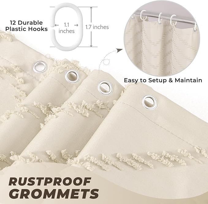 - 【Extra-Long 96-Inch Beige Fabric Shower Curtain with Boho Tufted Chevron Stripes】Designed for bathrooms that need extended coverage, this 96-inch extra-long shower curtain features elegant tufted chevron stripes. The neutral beige color blends seamlessly with various decor styles, including modern farmhouse, contemporary, bohemian, and shabby chic. Perfect for tall showers or high ceilings, it brings a stylish and sophisticated touch to your master or guest bathroom.