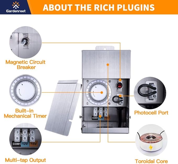 - Professional Grade Design - The 75 watt low-voltage transformer adopts a multi-tab output design of (12V/15V). The heavy 304 stainless steel metal casing is sealed to prevent rainwater from entering, allowing you to use it without worrying about its lifespan. The 100-foot 14/2 AWG electrical wire uses high-precision, oxygen-free copper with low resistance and good conductivity, allowing your lights to be used in a farther location without worrying about voltage drop or overheating issues.
