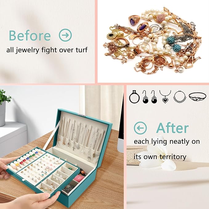 - Large Capacity: 23×17×8.5 cm. Design with the 2-layer structure for organizing all types of jewellery, including necklaces, earrings, bracelets, rings, hair accessories, watches, etc. The spacious space keeps your jewellery in order and can be easily found at any time.