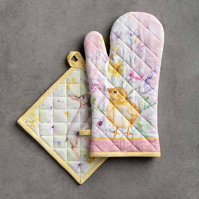 Maison d' Hermine 100% Cotton Oven Mitt & Pot Holder Set (7.5"x13" & 8"x8") Heat Resistant BBQ Cooking Gloves with Loop, Baking, Grilling, Kitchen, Handling Hot Pans Spring/Summer (Easter Zest)