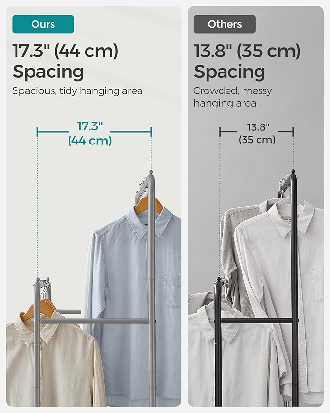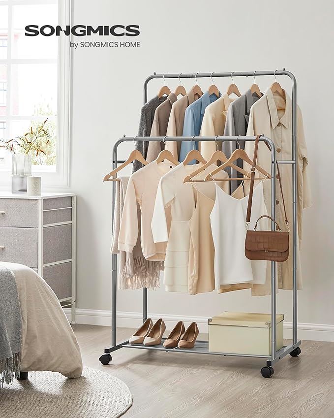SONGMICS Double Rods Clothes Rack with Wheels, Clothing Rack for Hanging Clothes, Heavy Duty Garment Rack with Mesh Storage Shelf, 2 Brakes, Each Top Rail Holds up to 77 lb, Gery UHSR026G01