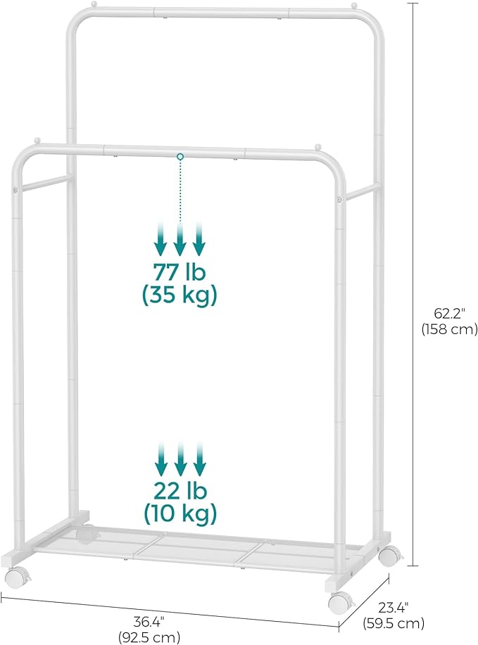 SONGMICS Double Rods Clothes Rack with Wheels, Clothing Rack for Hanging Clothes, Heavy Duty Garment Rack with Mesh Storage Shelf, 2 Brakes, Each Top Rail Holds up to 77 lb, White UHSR026W01