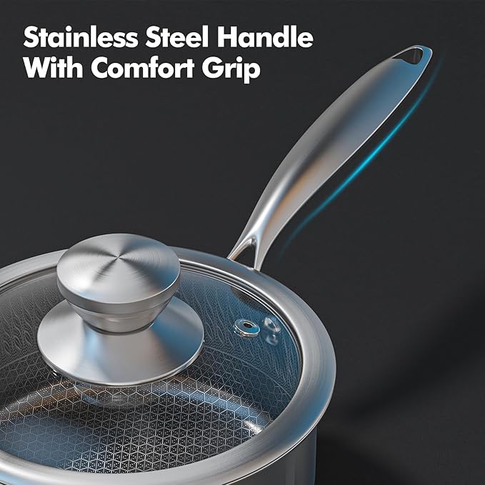 - Art & Life: The mirror-polished stainless steel cooking pot and pan set has a gorgeous, elegant exterior that complements the honeycomb-carved interior. The glass lids allow you to see the food change as it cooks, and the double riveted stainless steel handles stay cool at all times. Enjoy this artful and lifestyle set of stainless steel non stick cookware!