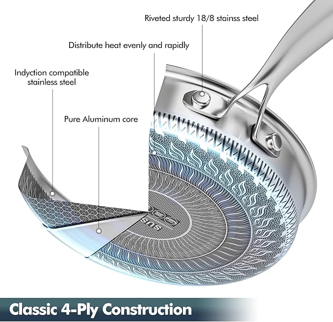 - Practical & Healthy: The nonstick cookware set is made of high quality 18/10 stainless steel, which is strong and durable to prevent scratches, corrosion, warping and rusting. A honeycomb carving is etched into the interior of the cookware, making it 10 times more non-stick than traditional stainless steel pans! Non-toxic, Free of PTFE, PFOA, PFAS, lead, cadmium and other toxic substances.