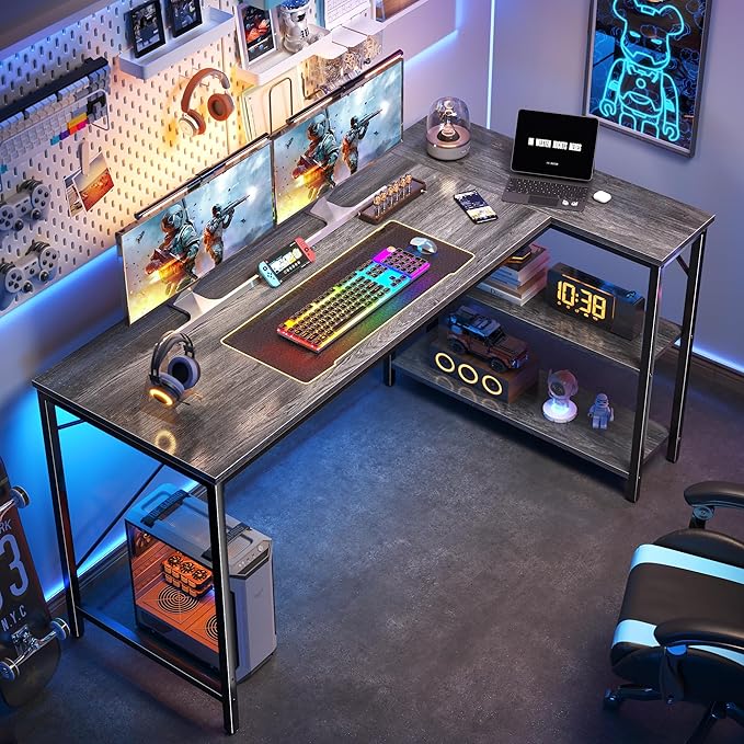 - 【Reversible L Shaped Computer Desk】: Perfectly tuck away in your home corner to extend office storage space. This Huuger desk with shelves also comes with reversible 2-tier shelves, allowing you to customize the layout based on your preferences