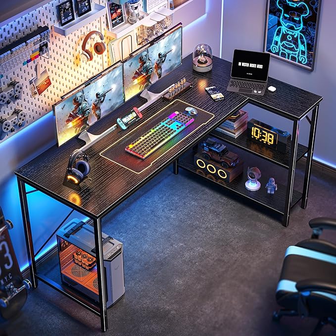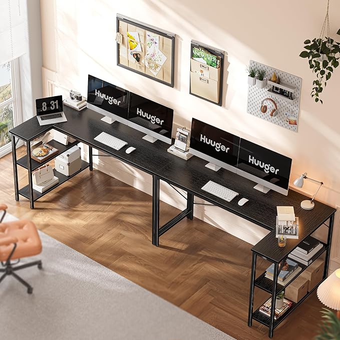 - 【Reversible L Shaped Computer Desk】: Perfectly tuck away in your home corner to extend office storage space. This Huuger desk with shelves also comes with reversible 2-tier shelves, allowing you to customize the layout based on your preferences