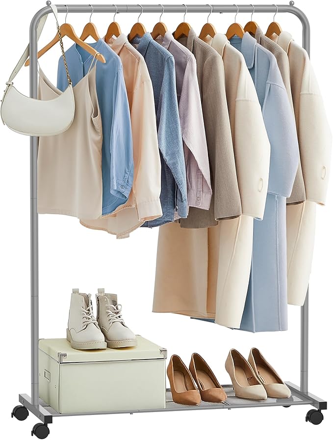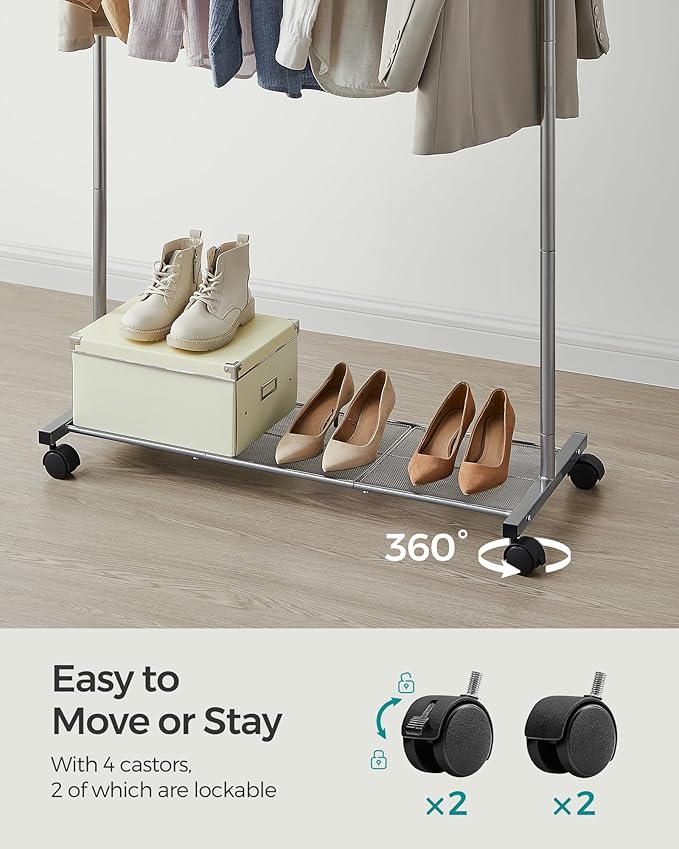 - [Easy to Move] 4 universal casters, including 2 with brakes, make it easy for you to move this garment rack from your bedroom to your coatroom and lock it in place as you need
