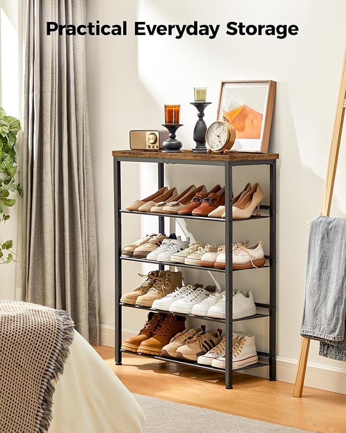 - Plenty of Storage Space: Organize your shoes and more with this 5-tier shoe rack for closet and entryway. With 4 metal shelves and a large wood finish shelf, it provides ample storage for all your footwear needs. Perfect for tight spaces like the entryway or closet.