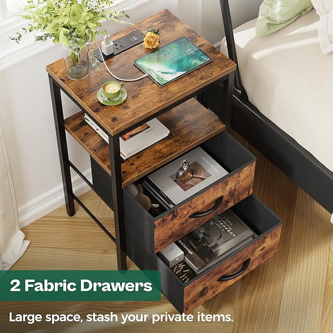 Huuger Nightstand with Charging Station, Fabric Drawers, End Table with Open Shelf, Bedside Table with USB Ports and Outlets, Night Stand for Bedroom, Rustic Brown