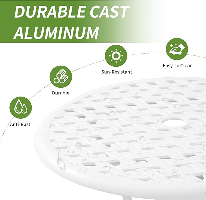 Patio Bistro Set 3 Piece with Umbrella Hole, Outdoor Bistro Table and Chairs Set of 2, Patio Bistro Set 3 Piece White, Cast Aluminum Furniture for Park Yard Front Porch