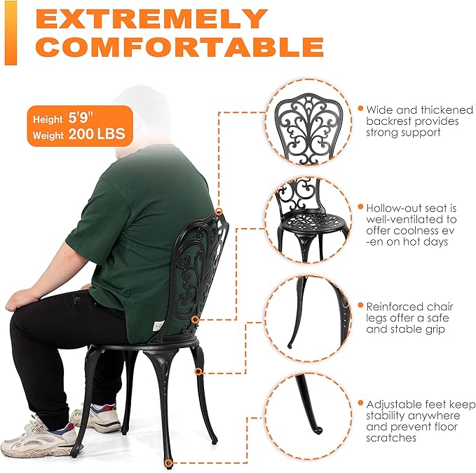 - EASY INSTRUCTION WORK: Strong yet lightweight cast aluminum frame makes this outdoor bistro set easy to be moved around. With detailed assembly manual and complete accessories, it is easy to be assembled well