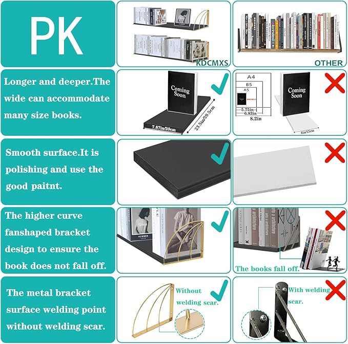 - Black Floating Shelves-The high curve fanshaped bracket design to ensure the book does not fall off.The Arc bracket of black gold shelf can block almost the entire surface of the book,while other triangular bracket can block only half the area of the 45-degree angle,and the book can easily fall off.