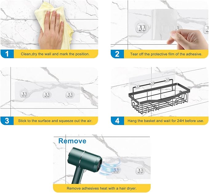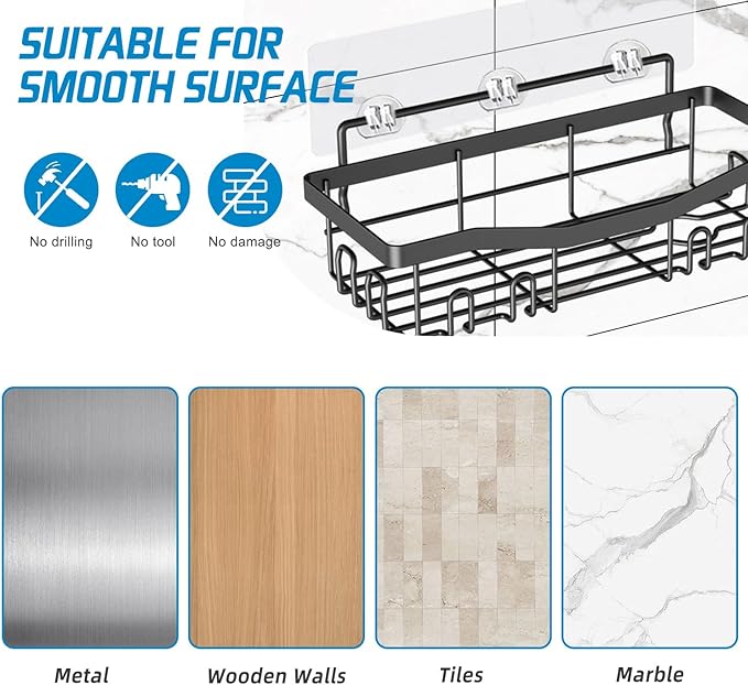 - Suitable for All Smooth Wall: Shower Caddy Basket Shelf is easy to install, no drilling and will not damage the wall