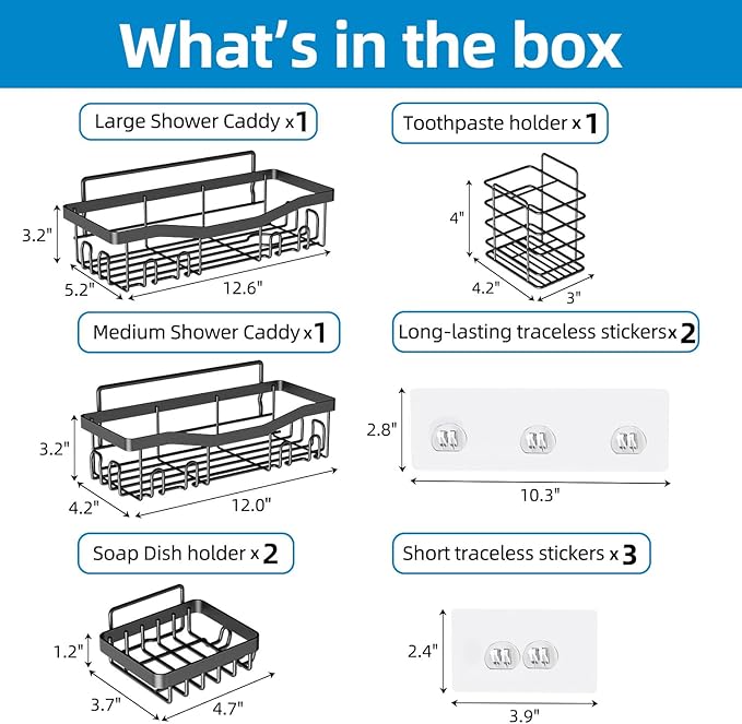 - Long-Lasting Shower Shelves: Shower caddies made of high-quality stainless steel, waterproof, rust-proof, scratch-resistant and can be used for a long time. The The hollow at the bottom of adhesives shower caddy can effectively drain water, keeping your shower supplies clean and dry.
