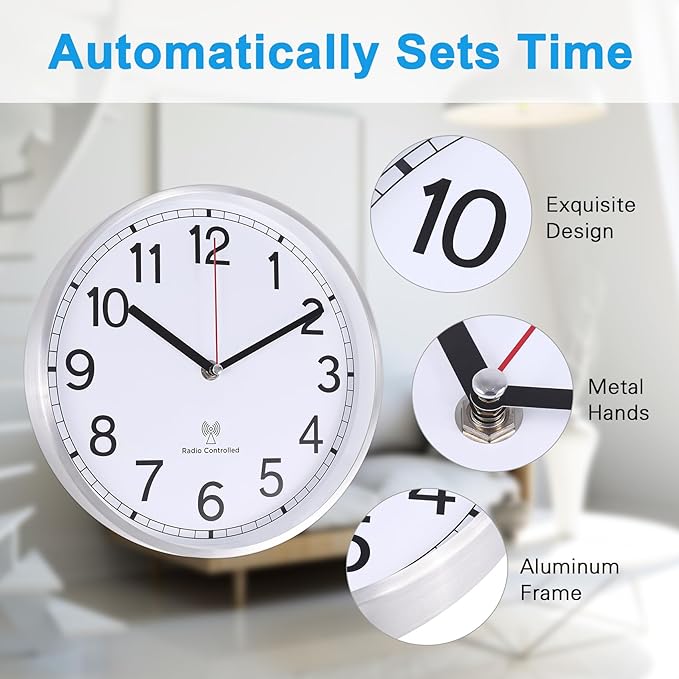 - Aluminum-frame Wall Clock:10 inch atomic wall clock is made of premium aluminum frame and clear glass. The white clock face with large black Arabic number makes it easy to read from a long distance