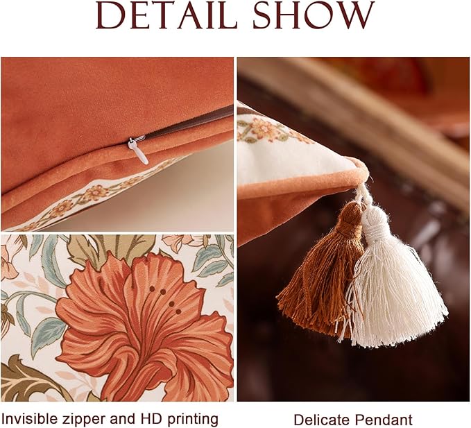 Throw Pillow Covers Pack of 4,Orange Floral Farmhouse with Wild Flowers Pattern Cozy Velvet Pillowcases,Decoration Square Lumbar Round Pillows Cushion Covers for Couch Bed Chair