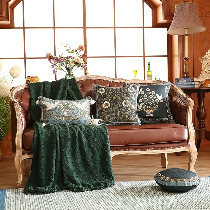 Green Throw Pillow Covers Set of 4,French Farmhouse with White Birds and Flowers Pattern Linen Pillowcases,Decorative Round Square Lumbar Pillows Cushion Covers for Couch Sofa Bed Chair