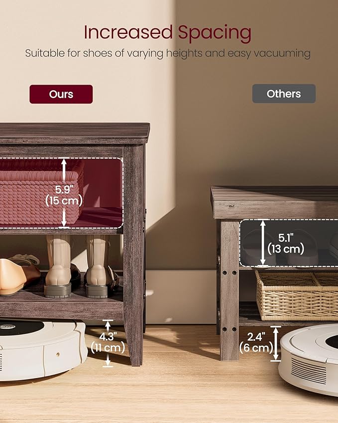 - [Increased Spacing] The shoe storage bench has two 5.9" high middle shelves for versatile shoe storage. The bottom shelf, positioned 4.3" above the floor, is perfect for placing slippers or for easy vacuuming