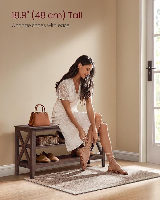 - [Farmhouse Style] Change shoes on this remarkable shoe bench with storage! The 2-tier maroon brown shoe bench adds a farmhouse flair to your home while offering ample storage space for your shoes